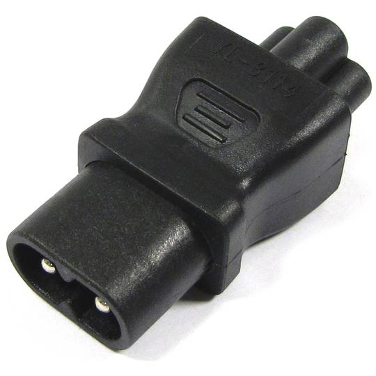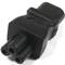 - Kompaktowy czarny adapter, który konwertuje wtyczkę C5 typu IEC 60320 (żeńska) na IEC 60320 C8 (męska).