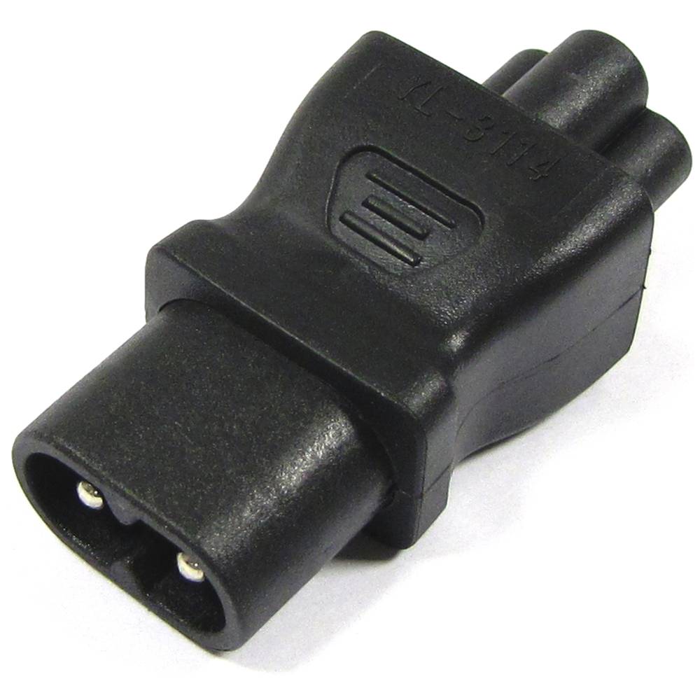 Kompaktowy czarny adapter, który konwertuje wtyczkę C5 typu IEC 60320 (żeńska) na IEC 60320 C8 (męska).
